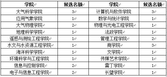 (二)本科生先进班集体候选班级由各学院在2016-2017学年校级先进班集体(见附件1)中择优推荐。其中, 大气科学学院、计算机与软件学院、电子与信息工程学院、商学院推荐2个班,其他学院推荐1个班,共22个班。